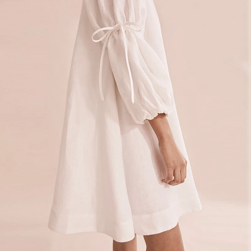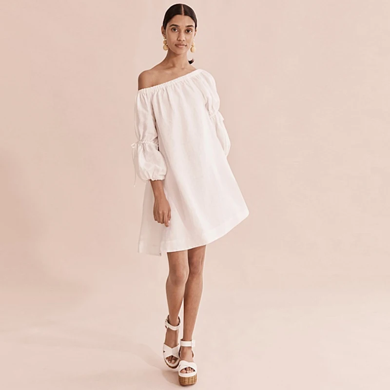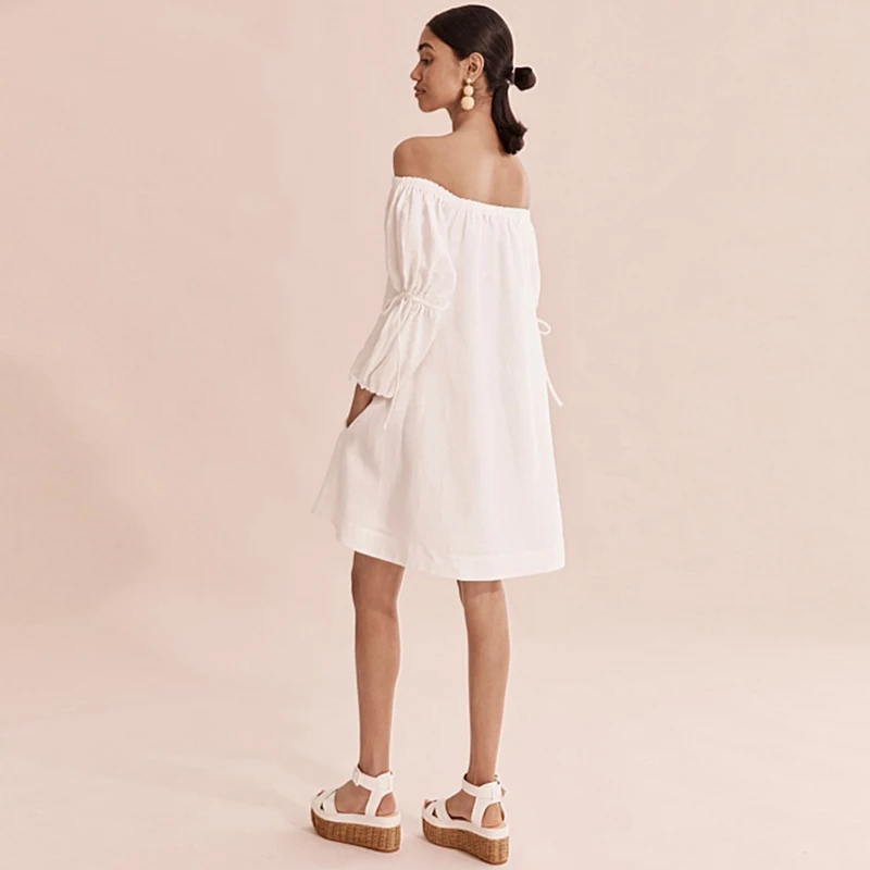 Women Linen Clothes Relaxed Summer Off-shoulder Tie Sleeve Linen Mini Dress